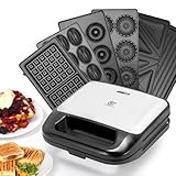 - Herausnehmbare, spülmaschinengeeignete Platten mit hochwertiger Antihaftbeschichtung : Waffelplatten (für 4 Waffeln), Cupcakeplatten (für 6 Cupcakes), Donutplatten (für 6 Donuts)