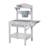 - SPEZIFIKATIONEN: Dimensionen H 88,5 x B 65 x T 35 cm - Maße der Wanne: H 9,5 x B 38 x T 31,5 cm - Grundmaterial: Holz - Zubehör: Kunststoff & Metall - Altersbereich: Ab 18 Monaten (Nutzung jeweils Indoor / Outdoor) - Farbe: Grau lasiert